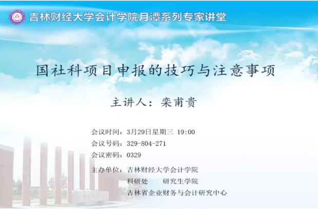 本网讯(会计学院 供稿)3月29日,会计学院邀请首都经济贸易大学会计学院教授、博士研究生导师栾甫贵教授,以线上会议的方式为学院师生做“国社科项目申报的技巧与注意事项”“两金”项目申报系列辅导。辅导会由会计学院副院长王丽南主持,会计学院教师,2021级、2022级全日制研究生参加了学习。