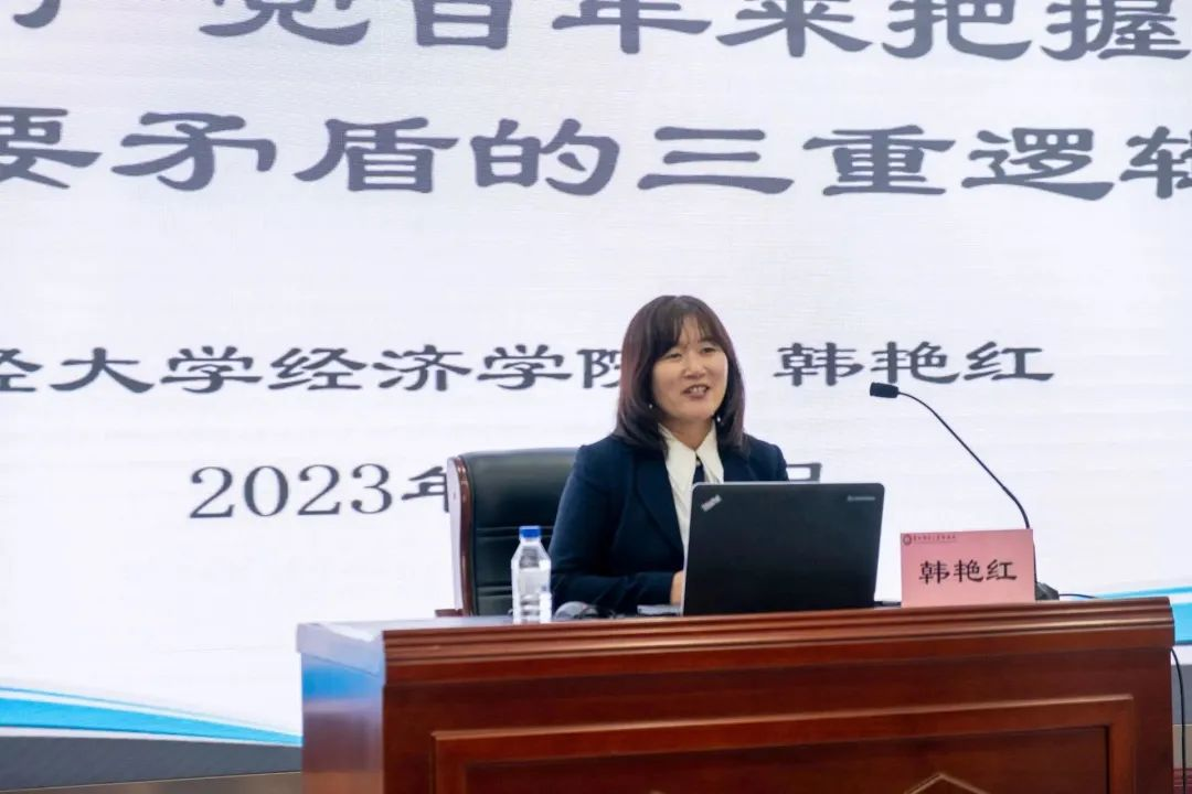 3月29日下午,科研处联合经济学院在1102报告厅组织开展了“吉财善水讲坛”第二讲,本次报告主题为“中国共产党百年来把握社会主要矛盾的三重逻辑”,经济学院韩艳红老师为主讲人。Beat365中文官方网站党委副书记、校长童猛,经济学院院长张洪梅、副院长王洋出席本次讲座,部分教师、研究生和本科生参加了讲座。讲座由经济学院副院长王洋主持。