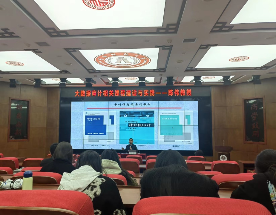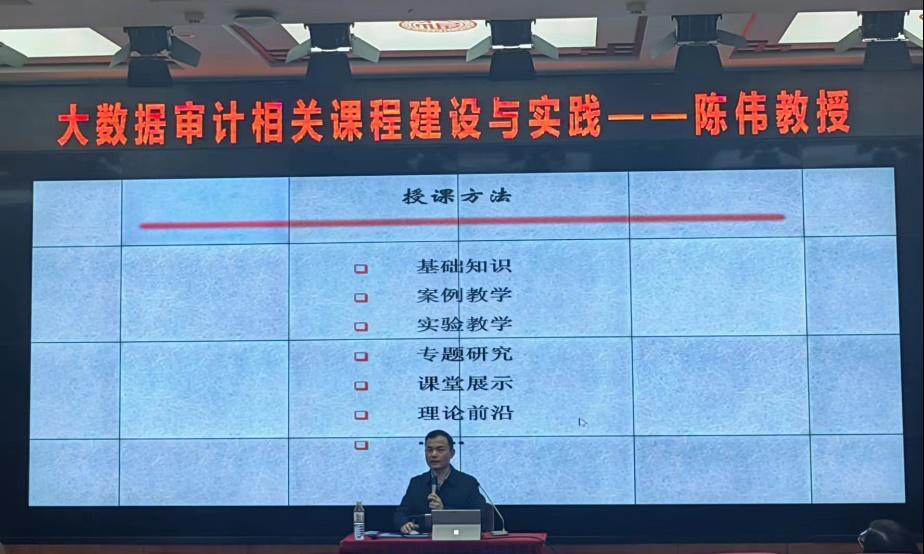 本网讯(会计学院 供稿)4月25日上午,会计学院举行“大数据审计相关课程与实践”学术报告会,本次会议由审计系主任吴昊洋老师主持,全体审计专业硕士研究生参加,本次报告会特别邀请南京审计大学陈伟教授进行报告。