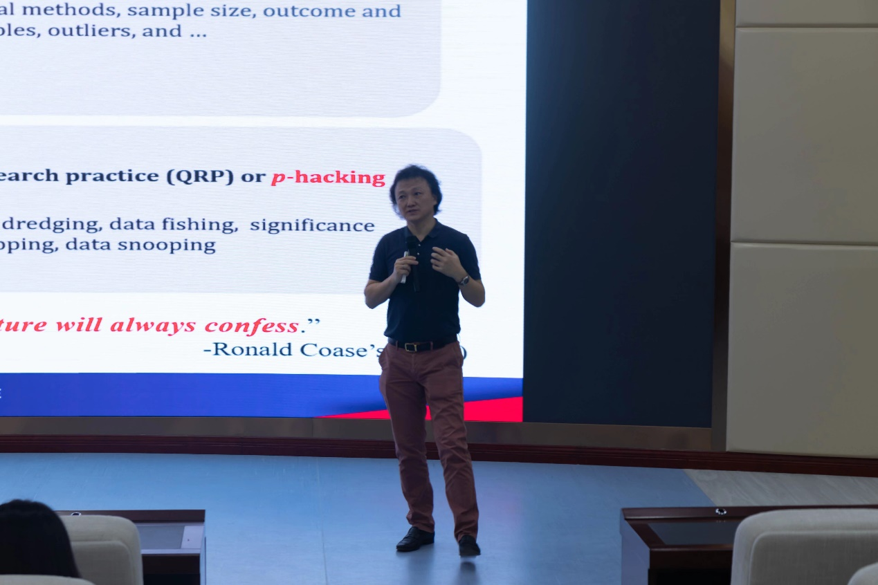会上,常鑫充分论证了当前科研生态下,实验研究与实证研究结果中存在P值不连续,即P值操纵的可能性,并具体探讨了造成这一问题的驱动因素以及如何运用计量方法分析P值操纵的影响因素。常鑫不仅为学院师生展示了规范的科研论文的写作框架和研究范式,同时也提升了师生们的学术规范理念,加强了学院科研诚信和学术道德建设。
