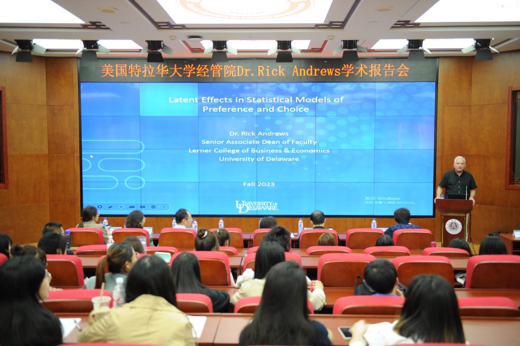 本网讯(国际经济贸易学院 供稿) 9月20日下午,美国特拉华大学经管学院Rick Andrews教授应邀到Beat365开展学术交流,作题为“Latent Effects in Statistical Models of Preference and Choice”的学术报告。报告会由国际经济贸易学院副院长王素玉主持,院长关嘉麟、副院长杨立国、学院部分教师及全体研究生参加了报告会。