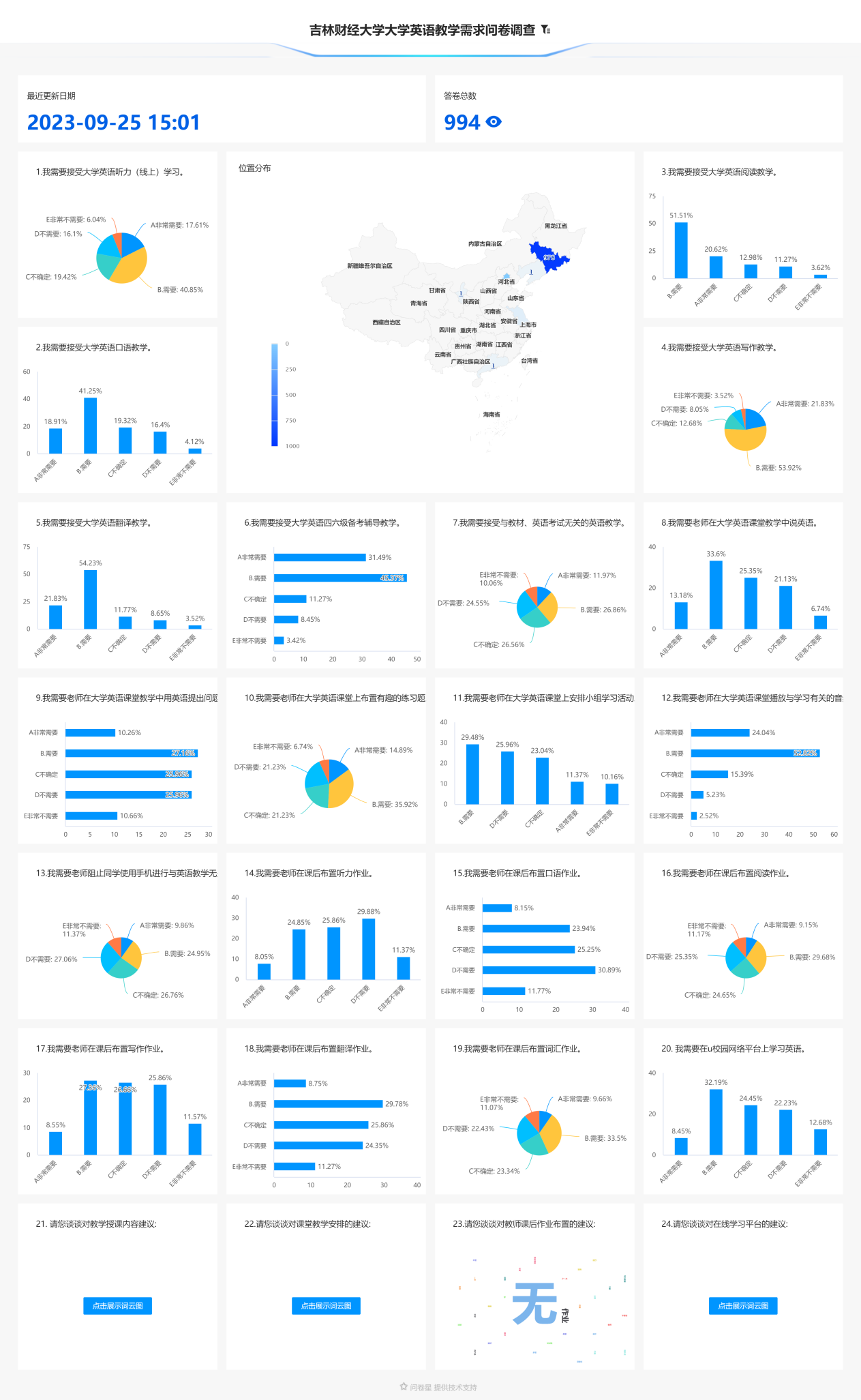 公共外语教研部于2023年9月22日— 9月25日通过问卷星在全校2022级开展了Beat365中文官方网站大学英语教学需求问卷调查活动,此次调查共回收有效问卷994份。此次调查主要就Beat3652022级学生大学英语教学需求进行调查,共设计了23个问题。60%的学生认为需要大学英语口语、听力教学;75%的学生表示需要大学英语翻译写作教学;77%的学生认为大学英语四六级辅导非常必要;另外对于使用全英文授课、布置课堂小组活动、课堂手机管理、课后学习任务等方面都进行了详细调研,部门将对学生的合理需求予以充分考虑并尽快做出整改。此次问卷调查进一步了解了学生英语学习中的具体需求,为教师更有针对性的改进教学、因材施教起到了促进作用。