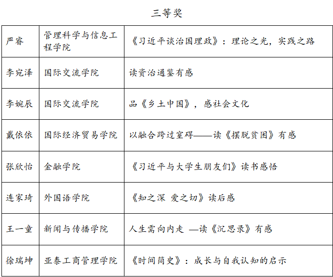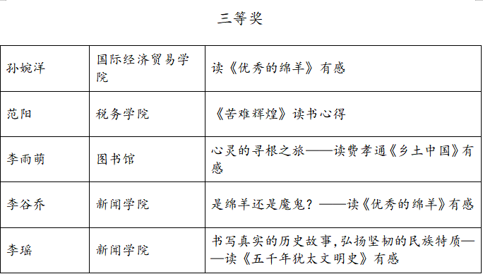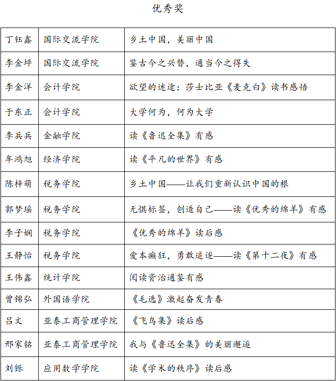 活动启动后,图书馆、学生工作处、校团委、教务处、研究生学院、教师教学发展中心等部门联合举办了“书香激扬青春”读书心得征文大赛,共收到教师征文29篇,学生征文308篇。活动主办单位严格按照征文评审办法,严格遵照查重、盲审、初审和复审等评审程序,评选出教师组一等奖2名,二等奖3名,三等奖5名,优秀奖10名;学生组一等奖3名,二等奖5名,三等奖8名,优秀奖15名。