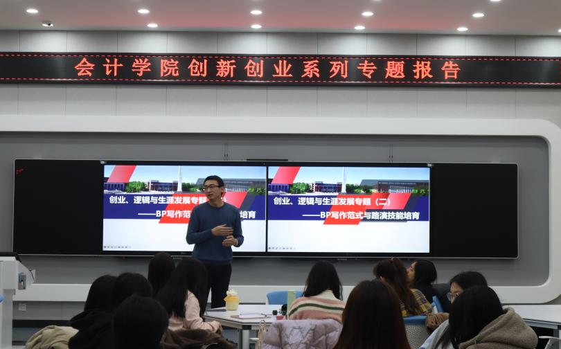 本网讯(会计学院 供稿) 11月22日,会计学院在新经济(数字经济)创新创业实训中心C202举办创新创业专题系列报告——BP写作范式与路演技能培育,由学校经济学院团委书记骆鑫主讲,学院相关教师、首届“科云杯”创新创业大赛参赛队员以及大四毕业生参加学习。报告会由会计专硕中心主任邵方婧主持。