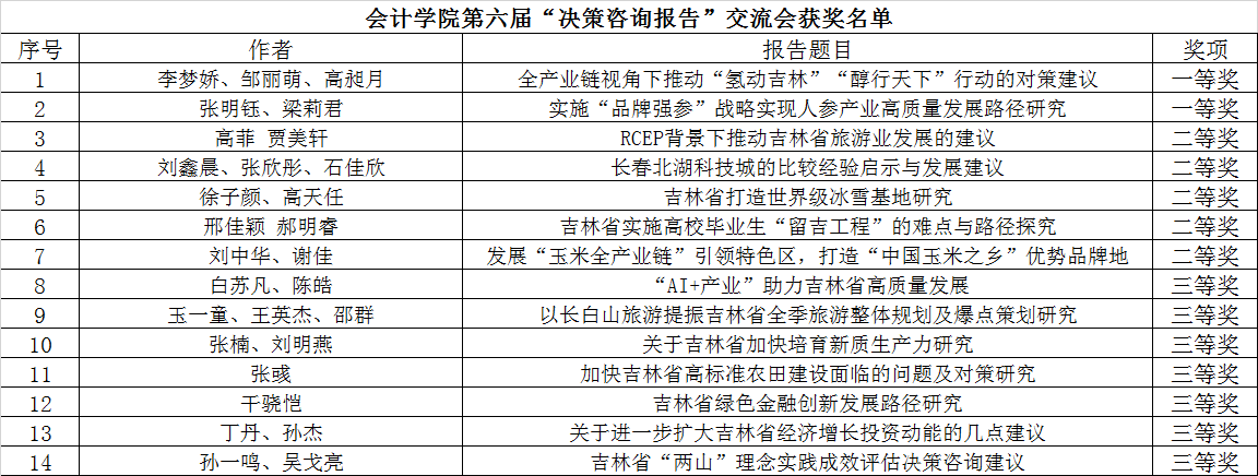 会计学院面向全院师生,于2021年10月发起成立决策咨询报告交流会。交流会扎根吉林大地,聚焦关键问题,旨在提高师生们建言资政的参与意识、关注社会发展与实践动态的综合研判能力、提升科学研究水平。交流会成立至今共计接收决策咨询报告128篇,部分报告被省市级领导批示或在核心期刊发表。