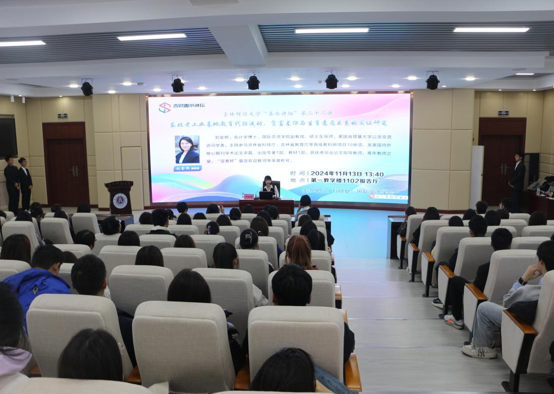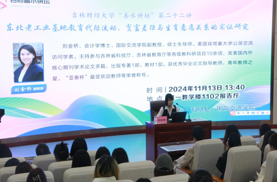 本网讯(科研处 供稿)为营造浓厚的学术氛围,增进学术交流,拓展学术视野,11月13日下午,科研处联合国际交流学院在第一教学楼1102报告厅举办了“吉财善水讲坛”第二十二讲学术活动,邀请国际交流学院刘金桥副教授做了题为“东北老工业基地教育代际流动、贫富差距与生育意愿关系的实证研究”学术报告。本次报告会由国际交流学院副院长李舸主持,国际交流学院全体教师和部分学生代表参会。