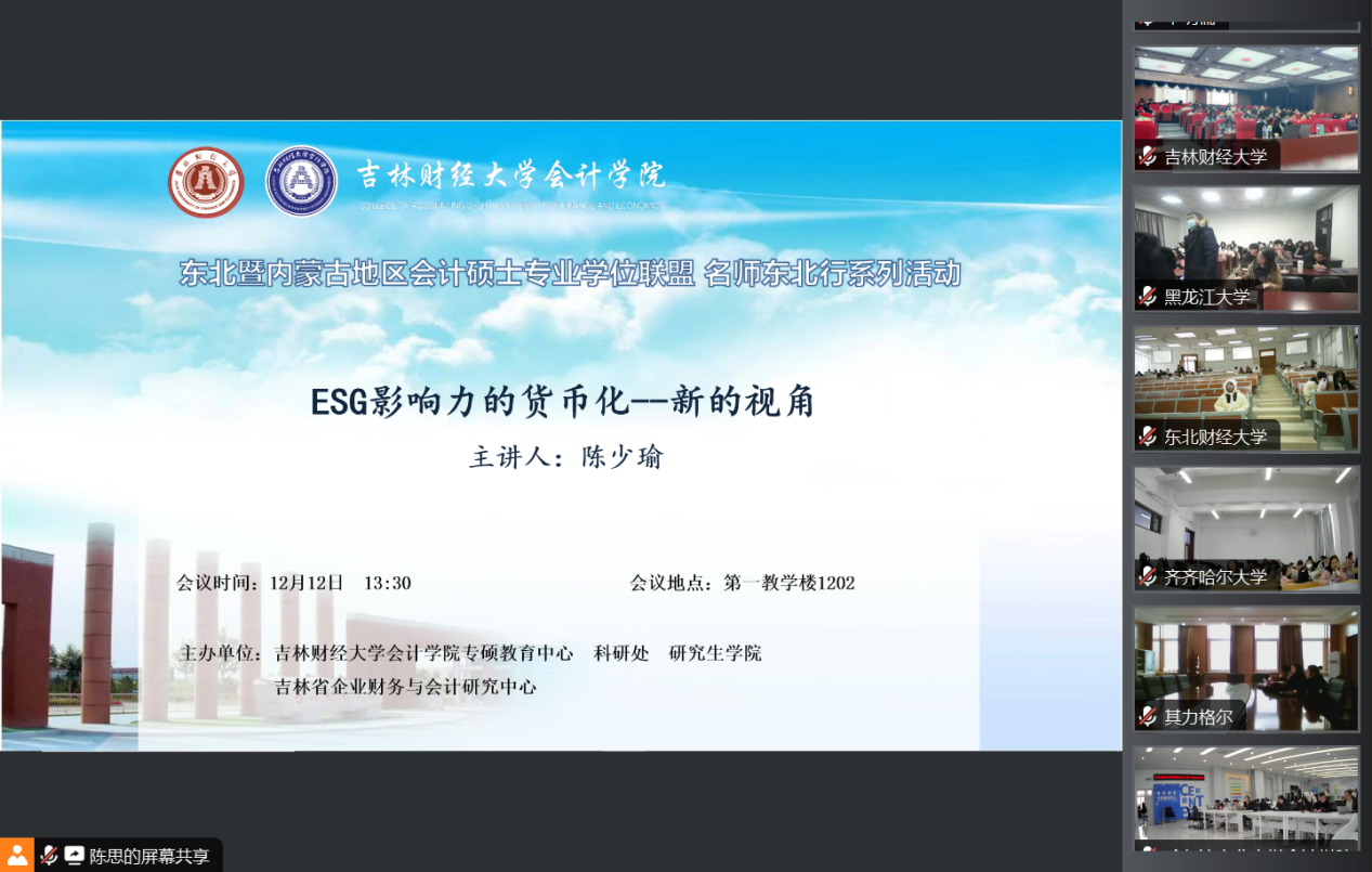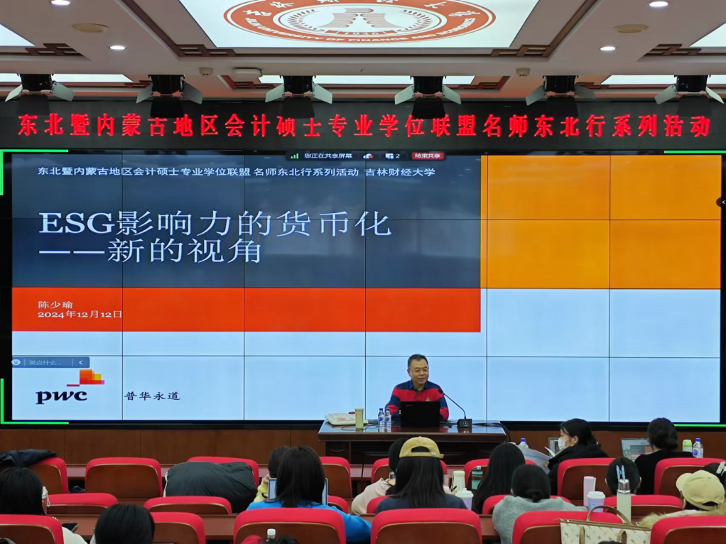 本网讯(会计学院 供稿)12月12日,Beat365中文官方网站会计学院举办东北暨内蒙古地区会计硕士专业学位联盟“名师东北行”系列活动,邀请实务专家普华永道中国资深合伙人陈少瑜先生以“ESG影响力的货币化——新的视角”为题,为会计学院老师和研一会计专硕研究生做专题报告,报告由会计学院专业硕士教育中心主任邵方婧主持。