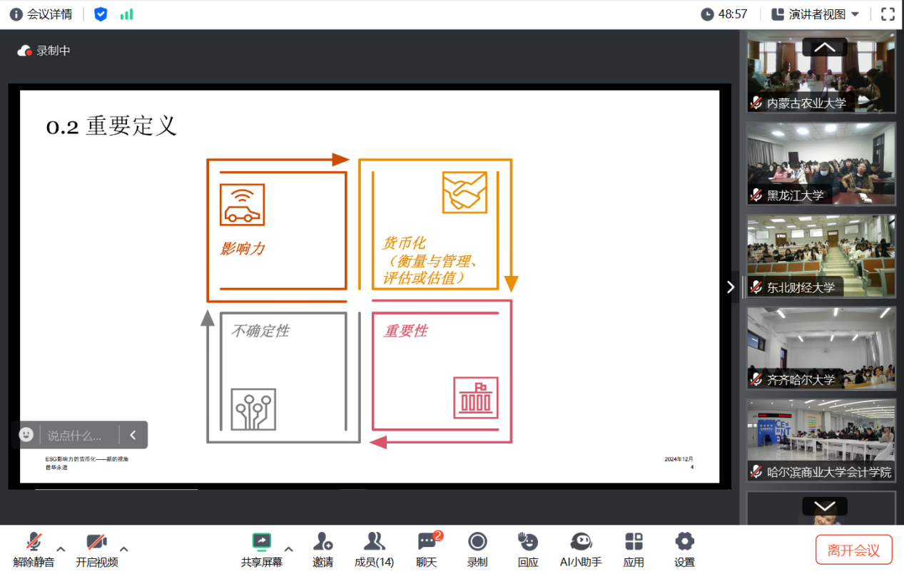 “名师东北行”系列专题讲座的开展,不仅为广大师生提供了学习前沿知识的优质平台,也彰显了东北暨内蒙古地区会计硕士专业学位联盟在推动学术交流、促进专业发展方面的积极作用。通过本次活动,激发了学生对 ESG 影响力货币化等新兴领域的研究与探索热情,传递了最前沿的实务知识,拓展了师生们的视野,解答了师生在研究和实践中的疑惑与问题。