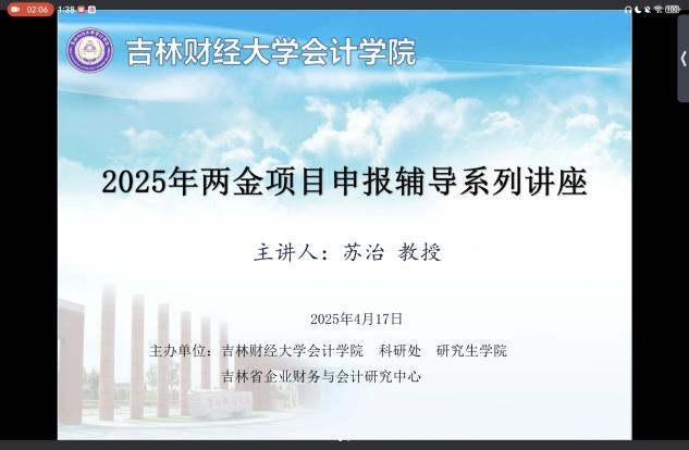 本网讯(会计学院 供稿)为提升教师科研项目申报质量,4月17日下午,会计学院举办2025年国家社科基金项目线上申报指导会,邀请中央财经大学苏治教授担任主讲嘉宾,为学院教师开展一对一精准辅导。