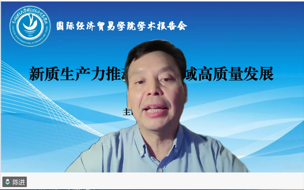 本网讯(国际经济贸易学院 供稿)6月4日,国际经济贸易学院邀请对外经济贸易大学陈进教授,通过线上方式为全院师生作题为“新质生产力推动商贸领域高质量发展”的学术报告。