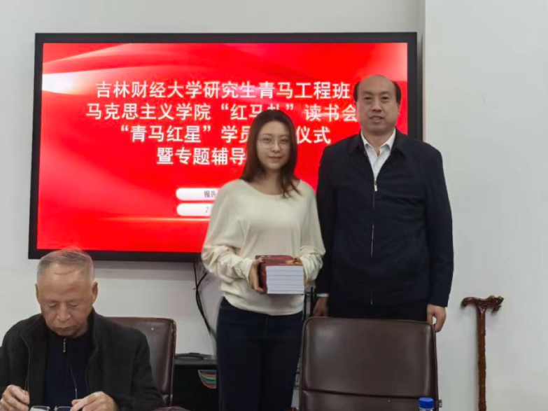 马克思主义学院党委书记黄建东为2025级学员代表颁发辅导教材。2025级马克思主义基本原理专业学生杨萌作为“青马工程”培训班代表发言,表达了对辅导学习的期待与决心,称会珍惜学习机会,提升自身理论素养和实践能力。