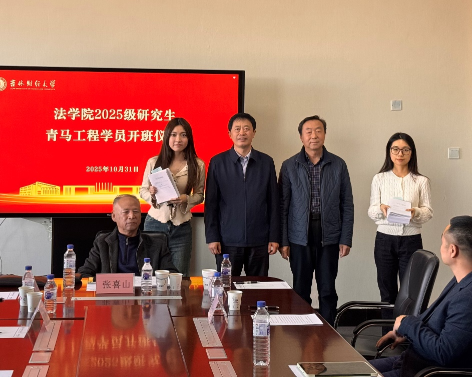 校关工委副主任刘国庆、法学院党委书记高原为学员代表颁发学习资料并合影留念。法学院2025级学硕班经济法学研究生陈祉妤代表2025级“青马工程”培训班学员发言,她表明了终身学习马克思主义的必要性与青马工程将带给学员们的全面收获,呼吁学员们要以高度的政治自觉深入学习习近平法治思想,紧跟党的步伐、奋楫“十五五”,为实现中国式现代化勇毅前行。