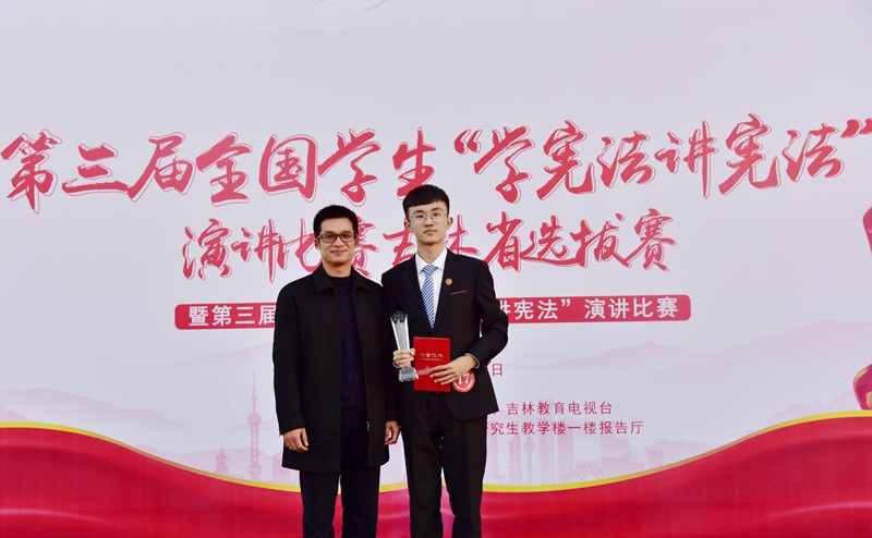 张漢泽同学排在第17位出场,他的演讲《用宪法,读懂国家》以大家耳熟能详的案例“呼格吉勒图案”切入,通过深刻的说理和富有感染力的抒情,精准诠释了如何在新时代读懂宪法精神的内在价值,讲好属于中国青年的宪法故事。张漢泽同学最终以97.52分的优异成绩荣获高校组一等奖。
