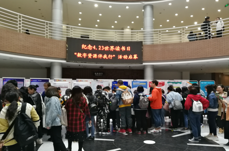 本网讯(图书馆 供稿)春风拂面,读书正好。为深入学习贯彻习近平新时代中国特色社会主义思想和党的十九大精神,贯彻党中央全民阅读的文化工程建设方针,建设书香社会、书香校园。 4月23日,纪念世界读书日之“数字资源伴我行”主题活动在图书馆二楼中厅举行。此项活动也是2019年图书馆“经世致用 阅行吉财”——“我爱4•23”阅读推广系列活动之一。