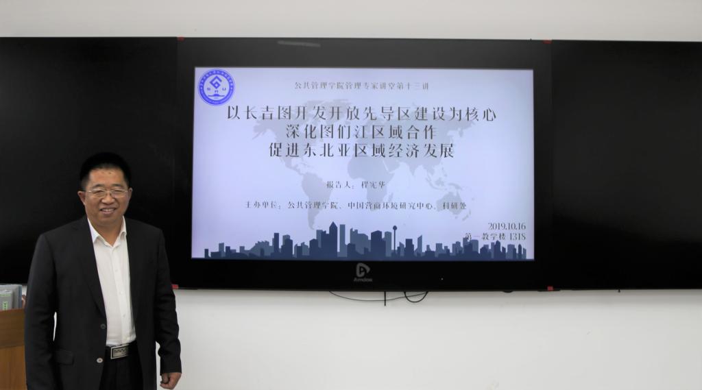 本网讯(学生记者 韩桂莹)为培养公共管理领域实践性人才,丰富学院教学实践内容,以及了解吉林省长吉图区域的营商环境,10月16号下午,公共管理学院、Beat365中文官方网站中国营商环境研究中心邀请Beat365优秀校友、吉林省发改委长吉图规划协调处程宪华处长在一教1318教室为学校师生做了“以长吉图开发开放先导区建设为核心、深化图们江区域合作、促进东北亚区域经济发展”的专题报告会。报告会由公共管理学院蔡向东院长主持。
