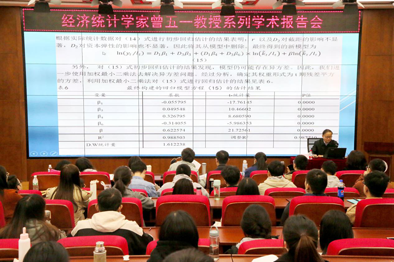 “中国全要素生产率测度的研究与经济计量实证分析中常会遇到的问题”报告主要分成两个部分:第一,问题的提出与分析思路,第二,实证研究中存在的问题及其改进方法。曾五一教授带领大家共同分析不同时期生产要素的产出弹性,不同时期的全要素生产率与广义技术进步率,利用资本存量数据作为研究的基础数据,采用一阶差分对数模型估计资本与劳动的产出弹性,对影响我国经济增长的因素进行实证研究。曾五一教授引领大家关注计算全要素生产率过程时如何选取保持经济含义、符合模型检验的特别处理方法,同时为老师和同学们在日后的调查研究选取数据时提供帮助和指导。