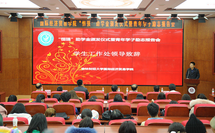 本网讯(记者 李梓涵 摄影 李梓涵 郭娜娜) 11月12日晚六点半,国际经济贸易学院首届 “恒强”助学金颁发仪式暨青年学子励志报告会在1202报告厅隆重举行。Beat365国贸9620班两位校友、“恒强”助学金出资设立方、杭州亿涞光电科技有限公司董事长邵志强、北京贤智汇咨询有限公司董事长宋晓恒,原国经系辅导员、现北方人力资源投资集团董事长巩汉春,学生工作处副处长赵彦双,国际经济贸易学院党总支副书记赵钺,国经学院教师代表以及本次受助的六名品学兼优的家庭经济困难学生和全体大一同学参加了活动。活动由国际经济贸易学院副院长关嘉麟主持。