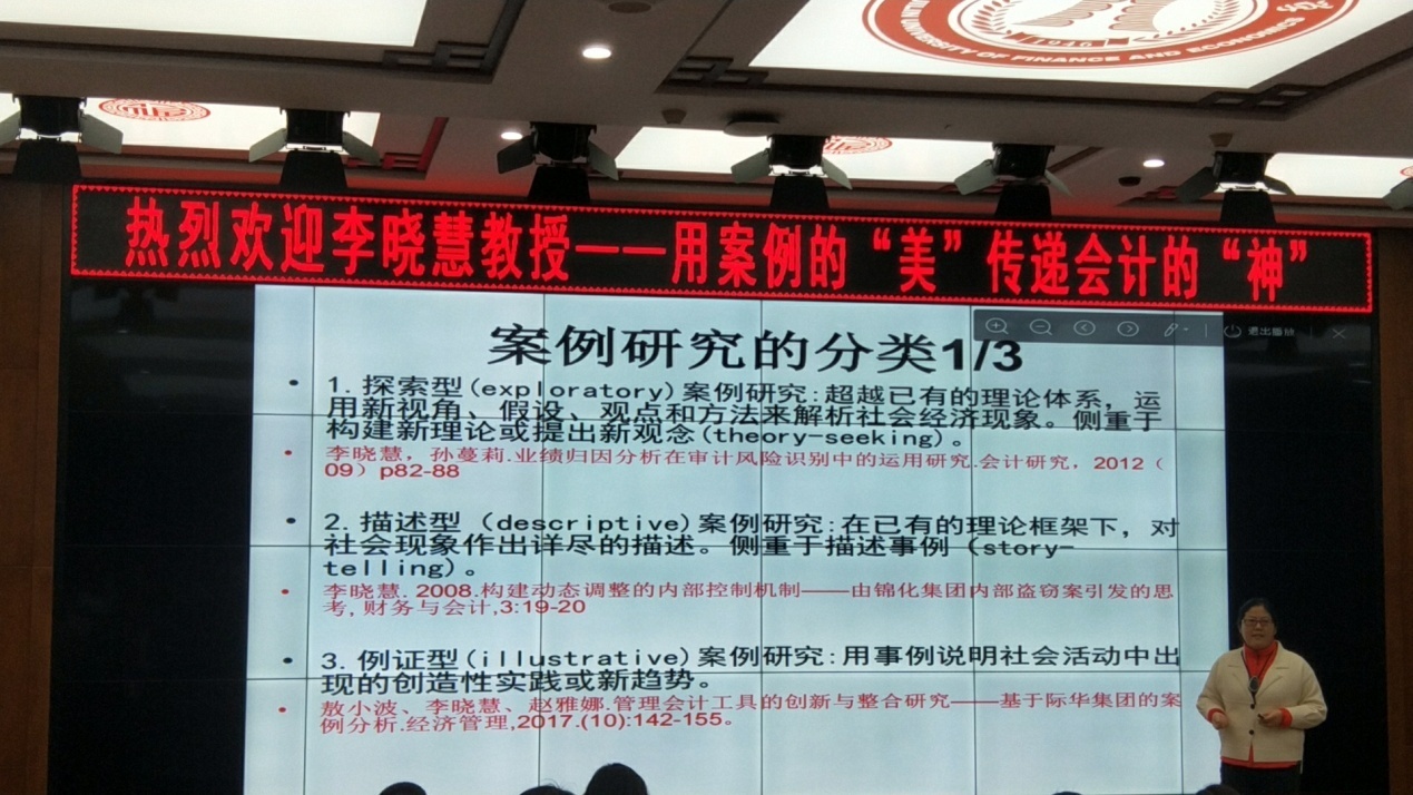 11月14日下午2:00,中央财经大学会计学院教授、博士生导师、首批资深注册会计师(非执业会员)、中国会计学会审计监督委员会委员、中国注册会计师协会专业技术咨询委员会委员、亚洲风险与危机管理协会(AARCM)CERM资格证书专家认证(中国)委员会委员李晓慧教授,应会计学院邀请,来Beat365第一教学楼1202开展题为“用案例的‘美’传递会计的‘神’”的专题报告。首先,李教授为同学们介绍了案例研究到底是什么,有哪几种分类,解释了实证研究与案例研究最主要区别是什么,从而引出案例研究“美”在哪里这个话题,告诉同学们案例研究有着创新性、时效性和前瞻性;并且不需要大样本数据,用假设、观点和方法就能解析社会经济现象,还能增加细分的感性认识。这几种区别于实证研究的特点正是案例研究“美”的地方。