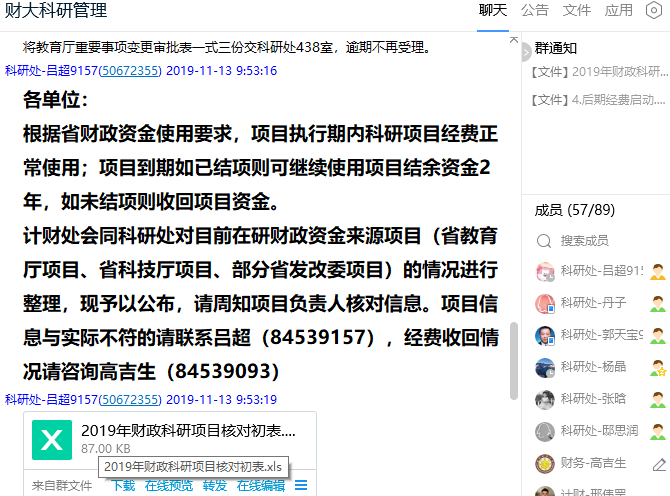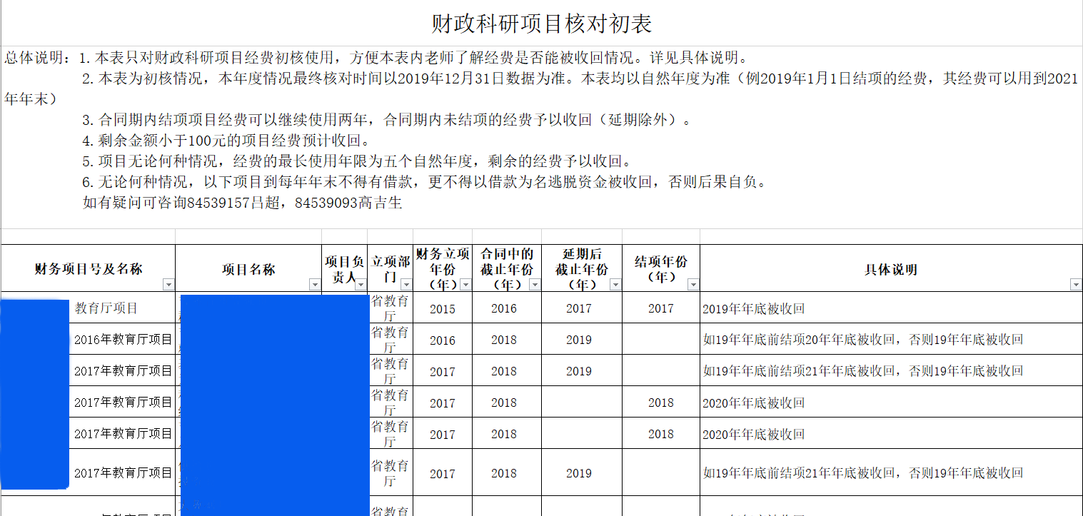 计划财务处与科研处工作人员利用十天时间对136名教师的187个财政科研项目逐一进行分析,列出明细表,表格上方写明政策解读和咨询电话,下面有对每一个项目的具体分析,使有关教师一目了然,明晰自己财政科研项目的具体情况及经费最后使用年限。该明细表已于11月13日在财大科研管理管理群里发布。