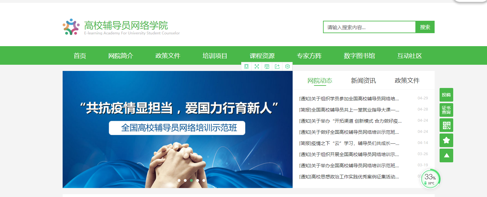 培训示范班由教育部思政司主办,高校思想政治工作队伍培训研修中心(国家教育行政学院)承办,培训时间为3月23日至4月30日。培训由“课程学习”、“在线答疑”、“主题研讨”、“心得撰写”四个环节构成,其中课程学习由直播、点播组成,培训内容涵盖“价值引领与思想引导”、“生涯规划与就业指导”、“疫情防控知识”等六大模块。课程整合了相关高校思想政治工作队伍培训研修中心资源,邀请到众多国内知名专家、学者、优秀辅导员,就统筹做好新冠肺炎疫情防控和大学生思想教育工作,面向全国高校思想政治工作队伍,在政治领导、思想引导、情感疏导、学习辅导、行为教导、就业指导等方面进行了系统的讲解辅导。
