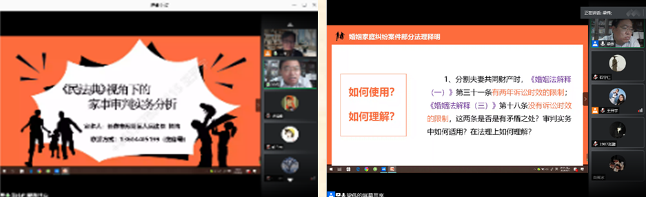 梁伟院长结合刚刚颁布的《民法典》从婚姻家庭编修改要点、婚姻家庭纠纷案件部分法理释明和典型案例解读及评析三个方面,针对时下比较热点的例如夫妻共同债务认定、离婚冷静期等内容,阐述了自己对于《民法典》婚姻家庭编的编订以及家事审判实务方面的一些见解,并提出法律硕士除了良好的理论基础,也非常需要实践经验的滋养。梁伟院长的讲座正是给大家弥补了平日学习中所缺乏的知识。
