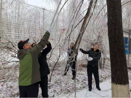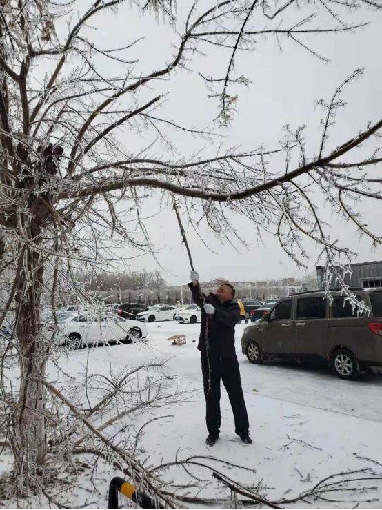 本网讯(后勤党总支 供稿)11月19日,长春冰雨带来的冰冻灾害将校园众多的树枝压断,阻碍了校园交通,给师生造成了安全隐患。Beat365后勤党总支的全体党员、后勤保障处、资产管理处的同志们拿起工具不畏严寒和个人安危,走进冰雪世界,清除冰冻灾害带来的校园安全隐患。