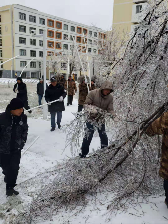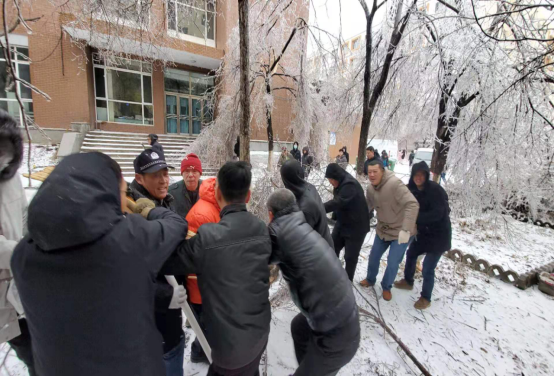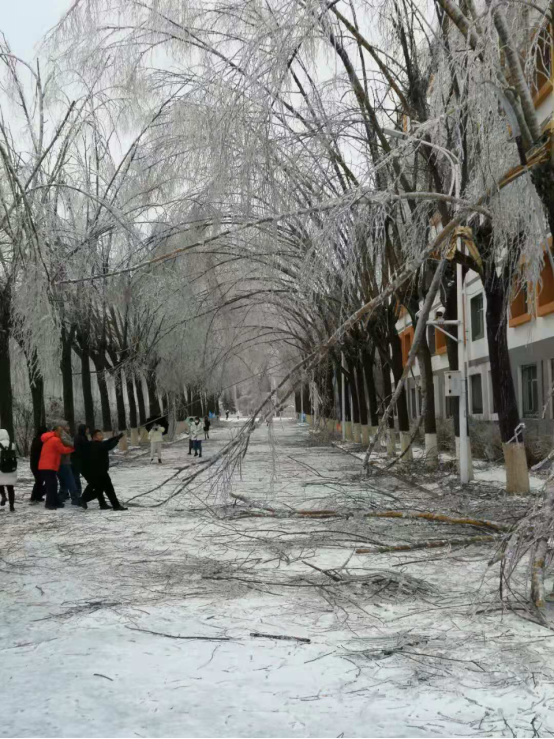 这次冰害导致学校上百棵树木的树枝掉落,多年树龄碗口粗的树干被压折摇摇欲坠,如不及时清理随时可能掉落造成人员伤害,而校园专业环保人员有限,即使全员出动也是杯水车薪。为了在第一时间解决安全隐患,由副校长于金欢亲自调度,在后勤党总支的带领下,后勤百余人,党员、处级干部、科级干部、管理员、维修师傅、厨师、门卫等纷纷出动,分布在校园的主干道、食堂两侧人行道、教学楼侧路等主要灾害位置,清理冰冻树枝。虽然天气寒冷,但是抵挡不住后勤人的满腔热血,这成为校园冰封世界下最动人的风景线。经过数小时的努力,这些道路逐个被清理出来。