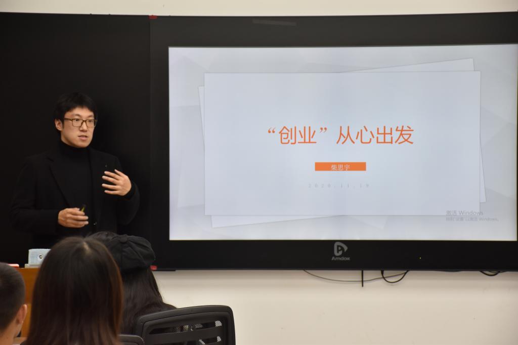 紧接着校友柴思宇根据自身的创业经历从“如何理解成功”、“创业精神的普世价值”、“改变从当下开始”和“办法总比困难多”这四个方面分享了自己的创业心得。