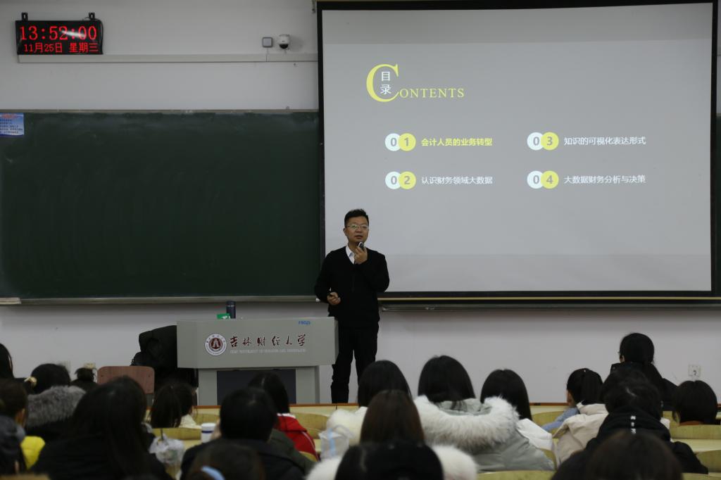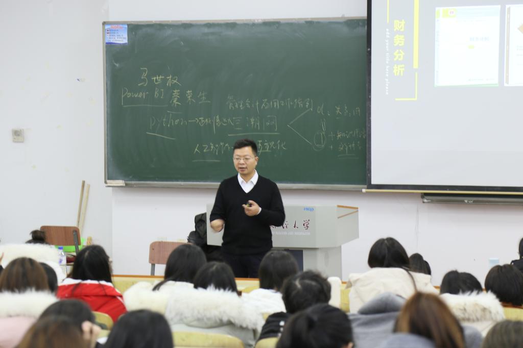 本网讯(会计学院 孙祯莲)11月25日下午1:30,跃客科技总裁,国家优秀教学成果奖完成人,教育部全国万名优秀创新创业导师,会计教育专家委员会委员,东北财务大学会计学院教学指导委员会委员,东北大学特聘企业导师,江西财经大学客座教授,曾任万达集团资金经理、中投发展集团高级经理、区域公司财务总监付伟老师,莅临Beat365第一教学楼1112开展题为“财务数据与商业智能”的专题报告。