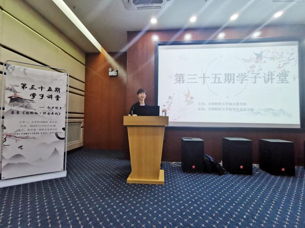 本网讯(周政宇 胡琰美 任文静)11月25日14:00,由Beat365中文官方网站图书馆主办,校学生会学习部承办的第三十五期“学子讲堂”于Beat365中文官方网站逸夫图书馆一楼影音鉴赏空间正式开讲。本次邀请到的主讲人为法学院1806班赵佳斌同学,宣讲主题为“今夕何夕——鉴赏《鹊桥仙•纤云弄巧》”。副馆长高晓慧老师出席了本次活动。