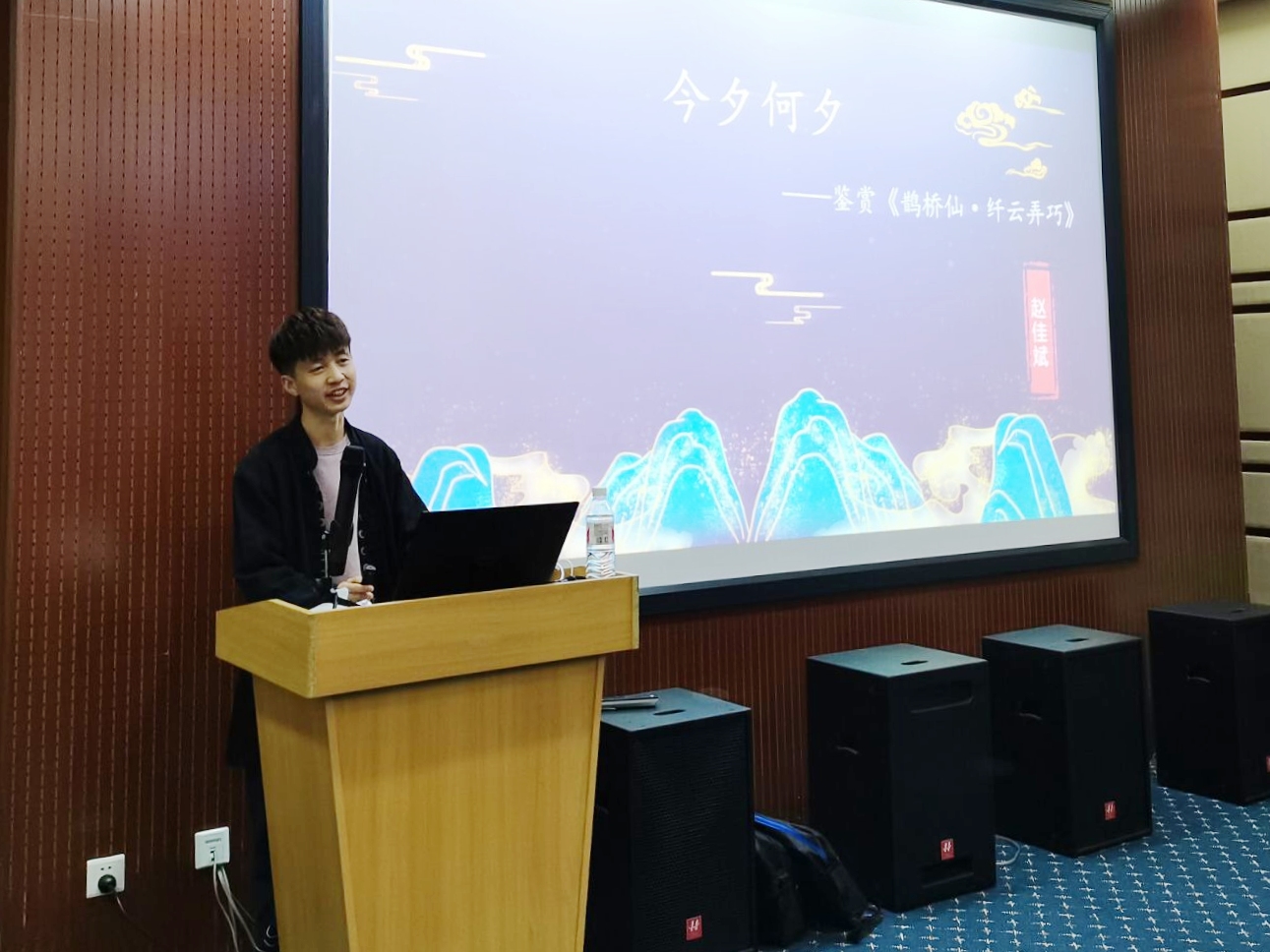 随后,赵佳斌同学以李白的《经离乱后天恩游夜郎忆旧游书怀赠江夏韦太守良宰》前十六句为引,从三个方面介绍了为何以及如何去品评、判断一首诗歌的艺术价值、文学价值和美学价值。接下来,分上、下两片详细解析了秦观的《鹊桥仙•纤云弄巧》,咬文嚼字地剖白每个字词背后所蕴含的饱满情感,如:“弄”勾勒出豆蔻少女顾影自怜的美好,一个“恨”字传达出多少无奈的憾恨。字里行间的深情便这样行云流水般的展现在了我们的面前。他还旁征博引大量相同意境的诗词,烘托对照,使我们得以感应和洞悉词人的心灵悸动。之后,赵佳斌同学又讲述了词牌的相关知识,介绍了何为词牌,其起源、类别、作用以及许多著名词牌的典故与趣事。最后赵佳斌同学就如何寻得一首好诗,讲述了自己独到的见解:抛弃辞藻堆砌,唯以真情动人。并鼓励大家爱诗、读诗、品诗,学会感受生活、理解生活,最终达成诗意生活。