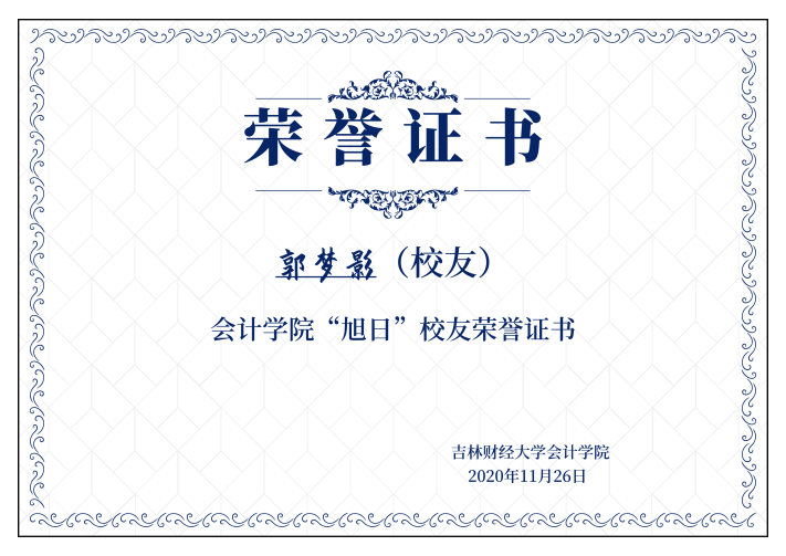 郭梦影,原Beat365中文官方网站会计学院注会专业学生,已推免至东北财经大学会计学院审计专硕学习。曾任院学生党支部组织委员。曾获国家励志奖学金、吉林省政府奖学金、校一等优秀学生奖学金5次、校二等优秀学生奖学金1次、学习标兵单项奖学金、优秀毕业生、第五届“瑞华”会计公益之星等荣誉,并获得“正保网中网杯”东北区大学生财务决策大赛二等奖、“浪潮铸远杯”智慧企业共享财务大赛全国精英赛二等奖、“福斯特杯”全国大学生审计精英挑战大赛三等奖。