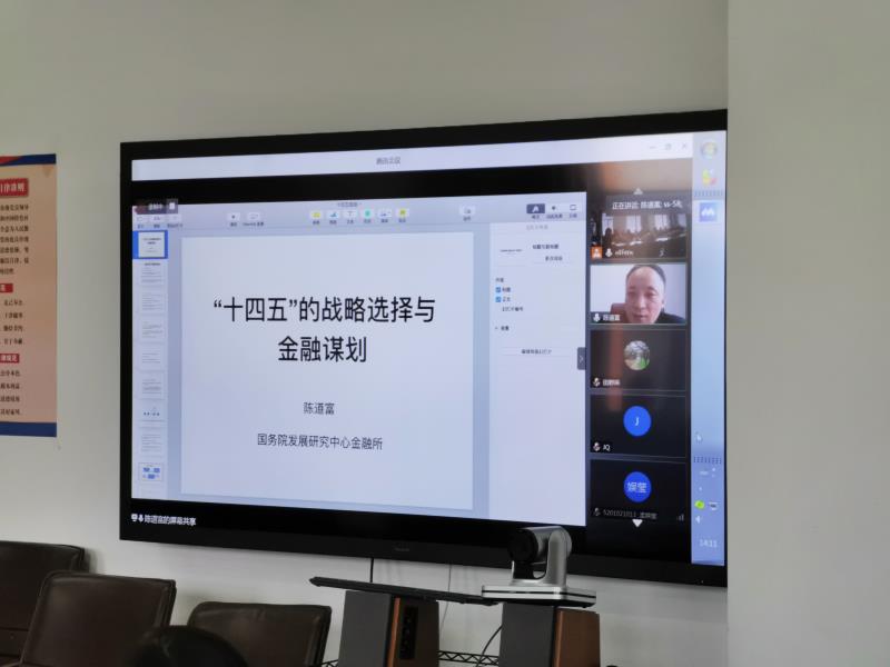 本网讯(金融学院 供稿)12月9日下午,金融学院邀请国务院发展研究中心金融研究所副所长陈道富研究员以“‘十四五’的战略选择与金融谋划”为主题进行线上学术报告。报告由唐亚晖院长主持,金融学院全体教师和研究生在线上和线下共同聆听了此次报告。
