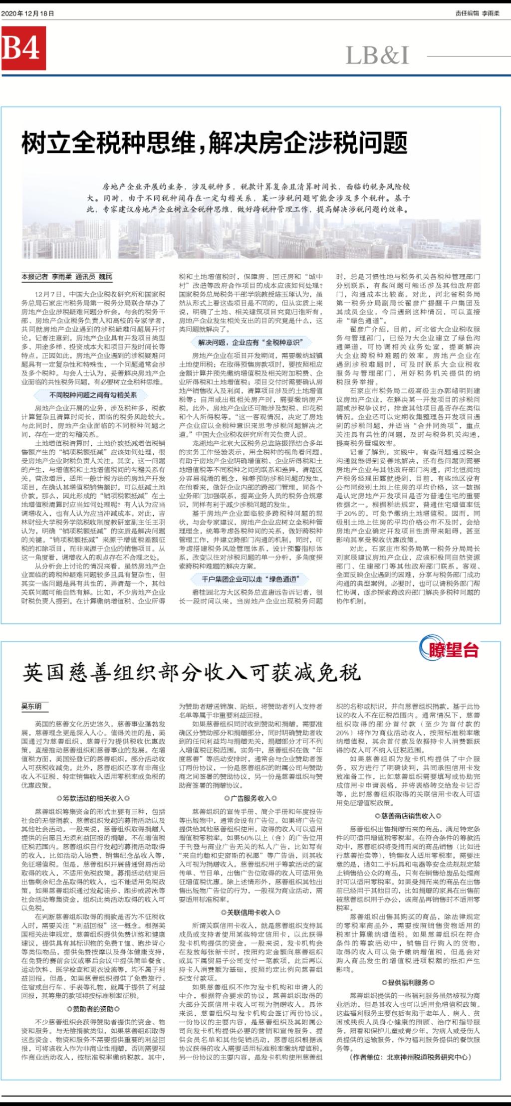 本网讯(税务学院 供稿)12月18日,《中国税务报》以《树立全税种思维,解决房企涉税问题》为题,用了较大篇幅,深入报道了Beat365中国大企业税收研究所举办的实务研讨活动——房地产企业涉税疑难问题分析会,很受业界关注。