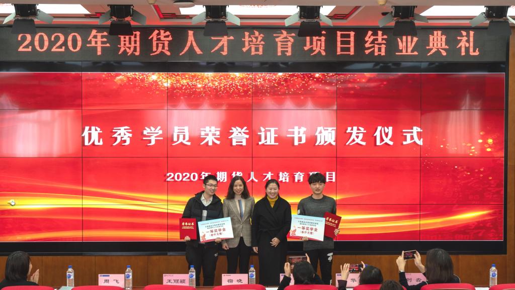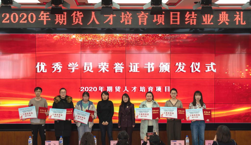 与会嘉宾为本期项目的12名优秀学员颁发了“2020年期货人才培育项目”奖学金和荣誉证书。获得一等奖学金的王禹博同学作为学生代表发言,分享了培训所带来的收获与感悟,他表示,通过系统学习充分认识到金融市场的错综复杂,通过真实案例分析、模拟操作和实地参观,真正了解了期货市场在实际运作中如何服务于实体经济,这些都激发了他继续深入学习的兴趣,为未来的职业发展积蓄力量。