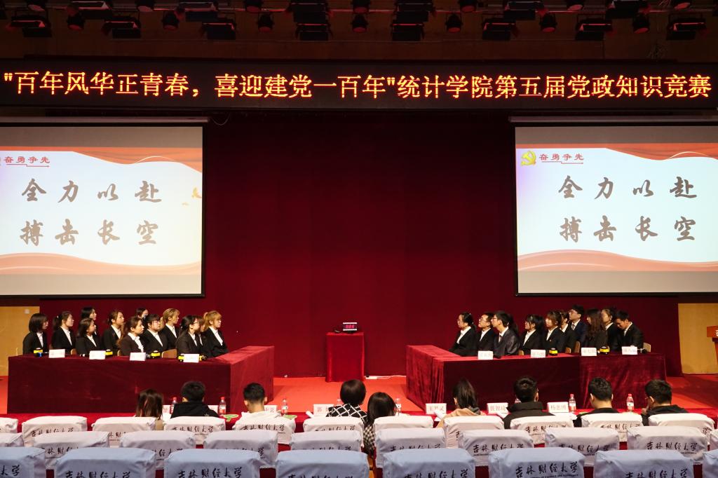 竞赛通过现场作答的方式展开,内容涵盖了党史、党章历史事件、人物等内容,比赛分为“奋勇争先”必答题、“电光火石”抢答题、“言报国新”视频题、“礼尚往来”描述题、“一触即发”风险题五个环节。经过紧张激烈、精彩纷呈的角逐,最终,选拔出来了一支优秀队伍,将由他们代表统计学院参加学校举办的党政知识竞赛决赛。