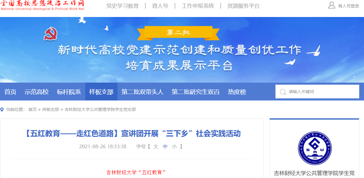 本网讯(公共管理学院 供稿)为深入学习宣传贯彻习近平总书记关于青年工作的重要思想,组织引导广大青年学生在家乡的热土上、在实践的课堂中受教育、长才干、作贡献,结合党史学习教育,经过申报,“五红教育”大学生理论宣讲团入选2021年吉林省大学生“三下乡”活动全省重点团队,并推荐为全国重点团队。利用暑假期间,公共管理学院组织32名宣讲团成员到吉林、辽宁、山西、江西、广西等5个省份26个地区开展暑假返家乡理论宣讲社会实践活动,引导学生党员和积极分子增强“四个意识”,坚定“四个自信”,做到“两个维护”。全国高校思政工作网报道了此次社会实践活动。