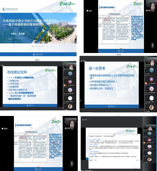 本网讯(会计学院 供稿)10月9日下午,西南财经大学会计学院教授、博士生导师步丹璐教授应Beat365会计学院的邀请,通过腾讯会议的方式为会计学院师生作主题为“外资控股中国公司的行为嬗变与利润流向——基于佳通轮胎的案例研究”的学术报告。本次会议由会计学院专硕教育中心主任苏宏伟老师主持,会计学院部分硕士生导师和2020级、2021级硕士研究生共同参与聆听。