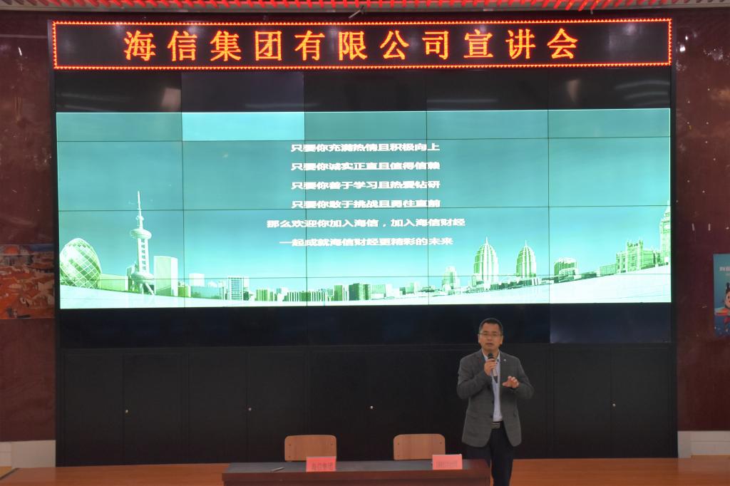 杨可多校友在宣讲中介绍了海信集团的发展现状和用人需求。他表示海信集团成立于1969年,现已拥有海信视像、海信家电和三电控股,三家在上海、深圳、香港、东京四地的上市公司。集团旗下有海信、东芝电视、gorenje、科龙、容声与ASKO等多个品牌。52年来,海信坚持“诚实正直、务实创新、用户至上、永续经营”的核心价值观和“技术立企、稳健经营”的发展战略,业务涵盖多媒体、家电、IT智能信息系统和现代服务业等多个领域。2020年营业收入1411亿元,同比增长11%,利润总额102亿元,同比增长29%;海外收入549亿元,占比已近40%;实缴税金104亿元。他强调,随着集体业务不断发展每年都需要大量的财务人员,海信迫切希望吉财的优秀学生能够加入他们与企业共同成长,实现理想。