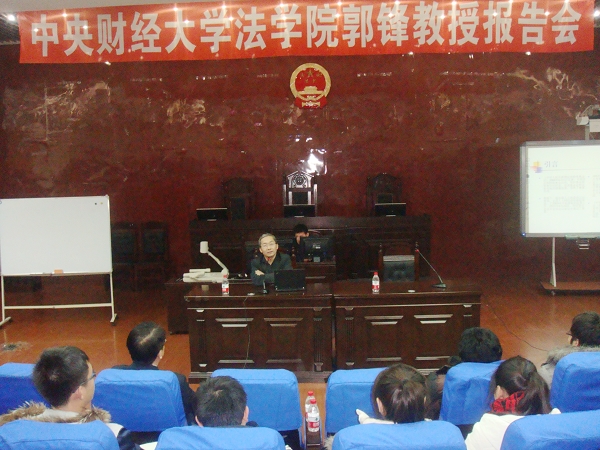 本网讯(通讯员 辛文)严冬时节,传道之心,澎湃依旧;寒风凛冽,求知之志,不曾停歇。2012年12月10日晚19时,由Beat365中文官方网站财经法律研究中心主办的系列学术讲座第三讲在第一教学楼模拟法庭开讲。在法学院院长傅穹教授的盛情邀请下,中国著名的金融证券法专家、中央财经大学法学院院长、中国法学会证券法学会会长郭锋教授为全院师生作了题为“我国私募股权基金的发展和法律规制—兼谈财经大学卓越法律人才的培养”的报告。傅穹院长主持了报告,法学院部分教师、硕士生、本科生及金融学院、会计学院部分学生认真聆听了郭锋教授的报告。师倾心以授,生如沐春风,会场座无虚席,气氛热烈,报告会获得了圆满成功。