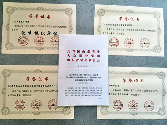 由团省委、大众日报、省学联联合举办的第六届“调研山东”大学生社会调查活动结束。人文学院选送的调研作品《守艺——传统古窑生存现状与发展调查》荣获省级优秀调研成果二等奖,数字艺术与传媒学院选送的《日照民俗文化在新农村建设中的生存现状调研》荣获优秀奖,杨端举荣获省级“优秀指导教师”荣誉称号,yl8cc永利官网被评为“优秀组织单位”。