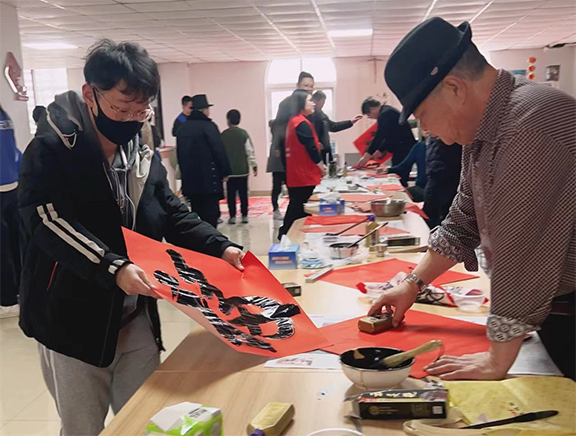 3、 将晾干的“福”字作品分发给参与活动的社区居民们,为他们送上新春祝福。