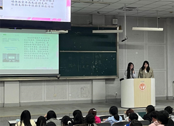(图为颜玺格为新生讲解团支部日常开展主题团日活动)