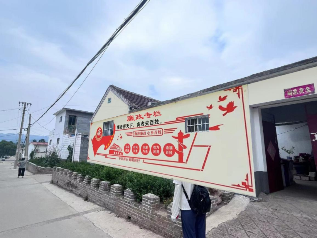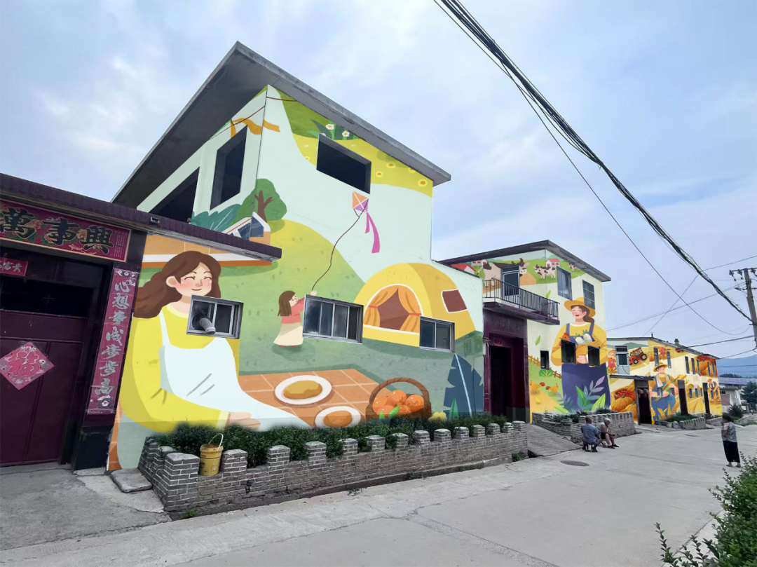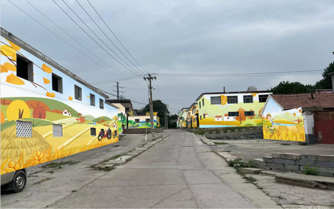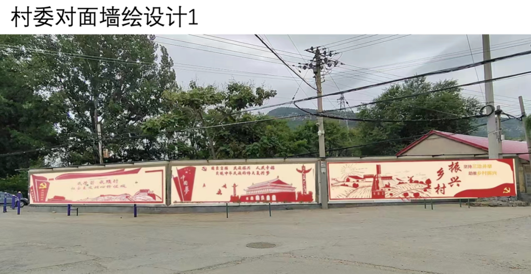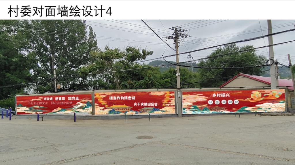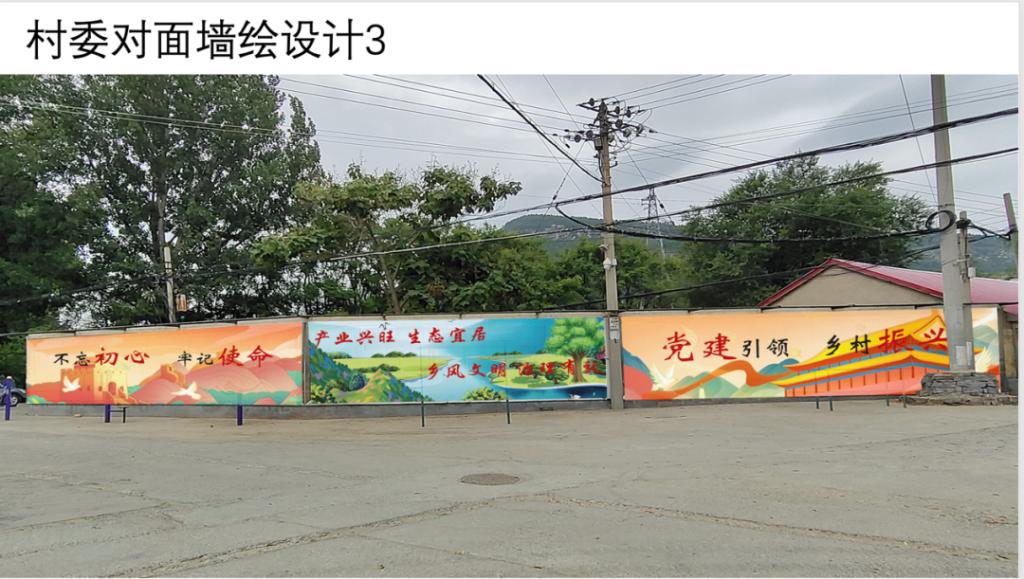 除了对玉珠泉进行有针对性的改造设计,三组成员设计了一系列红色引领、美丽乡村、生态可持续发展等主题富有创意的墙绘项目,旨在助力乡村发展。这些墙绘作品不仅美化了乡村风貌,更将党的领导和人民生活紧密融合,为乡村注入了充满活力的文化元素。
