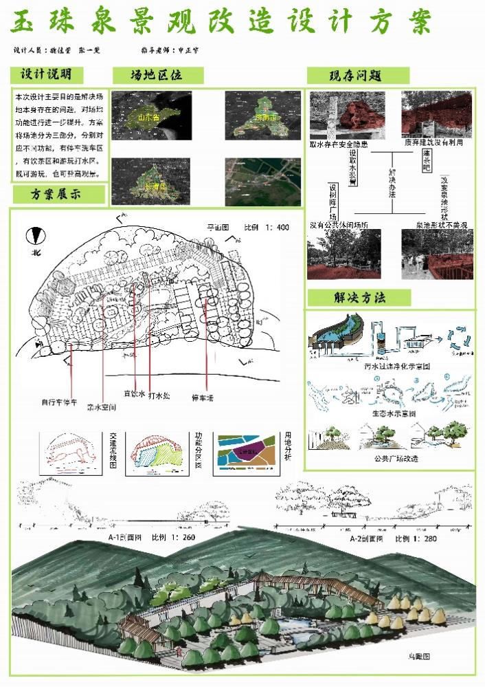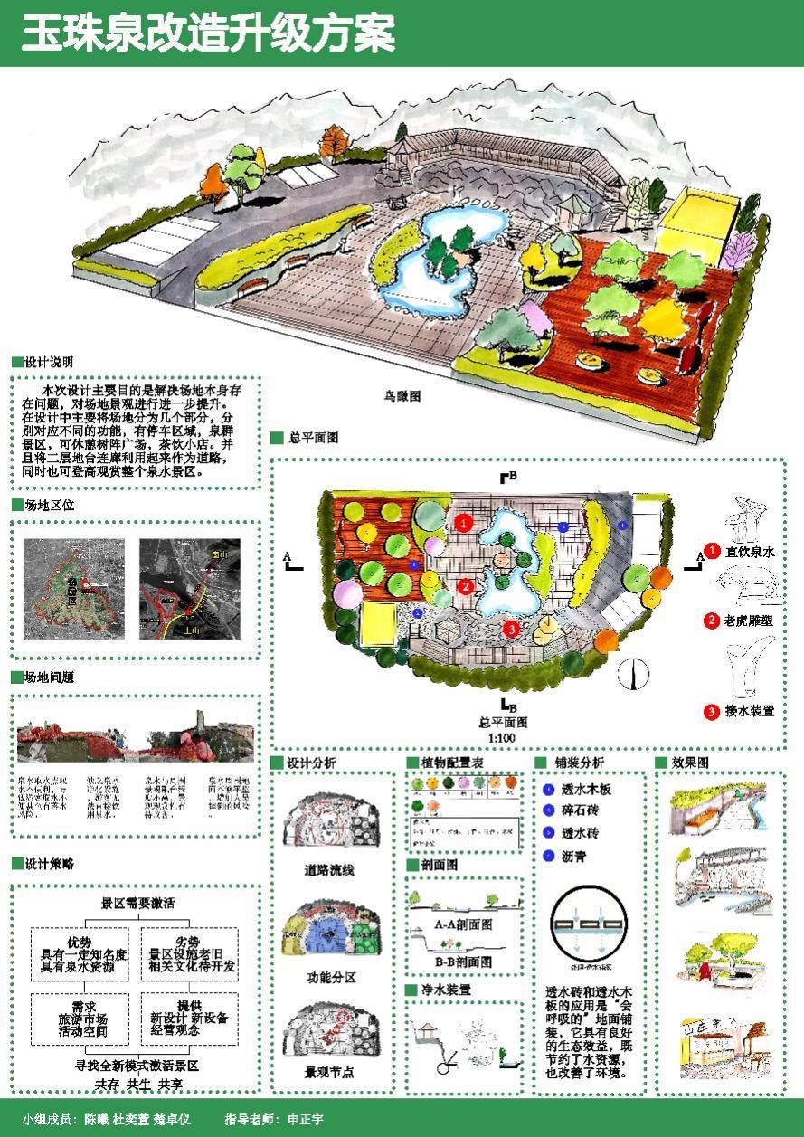 玉珠泉改造后,用两层绿篱隔离马路和景观,形成微封闭入口。原有水池变成观赏性喷泉,设有跌水景观和净水设施。池塘两侧设长椅,荷花、杨柳装点,另两面有喷泉戏水区和交谈台阶。设有直饮水装置,水系统循环再利用。