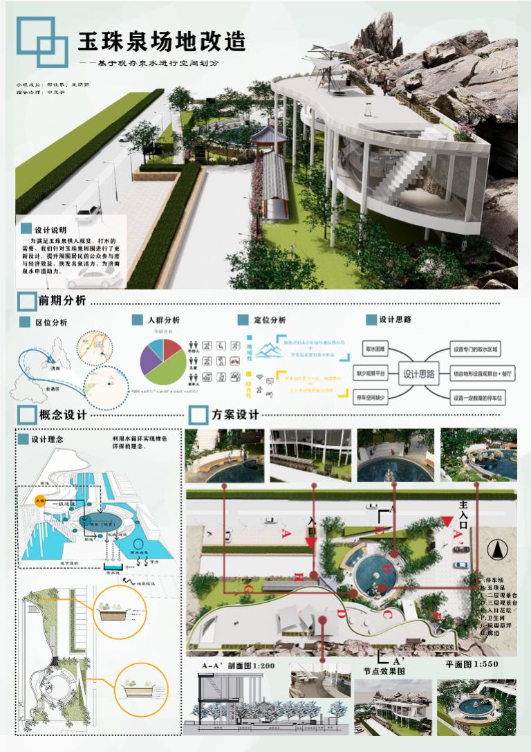 针对性地对玉珠泉景区进行了改造设计。首先增加停车区域,解决游客停车问题。整合原有的三个泉池,形成一个完整的水面。另外,在平整地面上增设树阵广场,既提供休闲空间,又起到宣传的作用。场地各处增加直饮泉水装置,方便游人品尝泉水。对于原有山脚部分的问题,设计了泉水净化装置和接水装置,解决了取水不便和泉水交叉污染的问题。另外,利用位于泉眼后山体上方的二层地台,搭建了中式连廊,连接不同区域,同时也提供了观赏的机会。