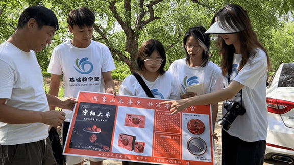 第四站:团队到达宁阳县葛石镇,参观千年枣树王,访谈乡镇相关人员,在了解当地政府和枣农需求的情况下,结合所学专业为他们提供了一些文创产品的设计思路和效果图。