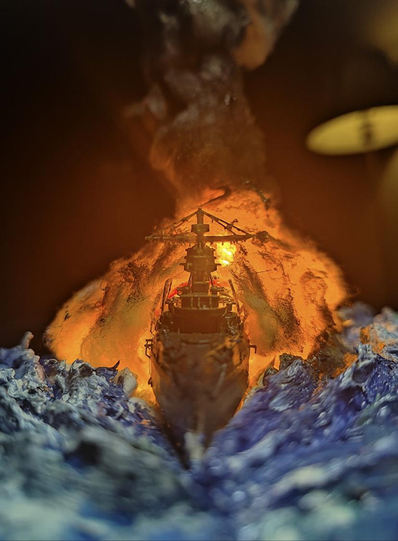 团队通过对多处红色圣地实地考察调研,根据相关历史记载,与专业知识相结合深入了解了1904年11月16日的"烟台俄舰事件”,复原制作了1905年日俄战争中,俄罗斯战列舰“皇太子号”的相关场景,采用模型复原的方式更加直观的展现了历史战争的经过。充分的利用了团队成员各专业的优势,将更迭的历史与现代文化艺术风格相结合,传承工匠精神。用手工艺术表达传递红色文化,用现代感吸引大众,能够更好的推进对胶东地区历史文化的宣传,从而吸引更多的人来走进历史了解历史、传承历史。
