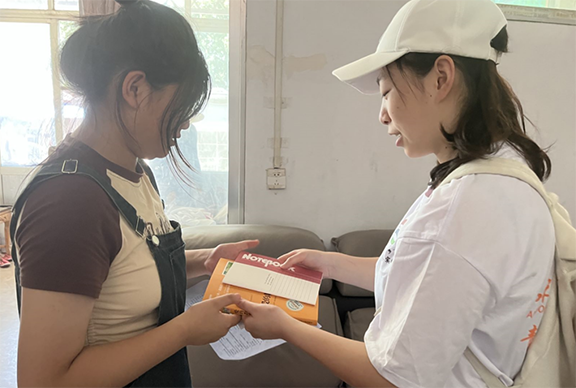 7月9日至21日队员们深入了解了69名困境儿童和18个困难家庭,发放生理卫生知识三折页,并为她们普及生理卫生健康知识以及心理辅导。队员们发动力量号召周围的小伙伴一起筹备书籍,一共收到150多本不同类型的书籍赠送给他们。同时还尽自己的专业知识,交给孩子一些美术方面的知识,让孩子开拓视野。