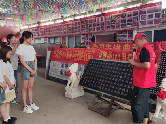 顺着运河继续追溯红色历史,“寻源溯流,青春纪行”党史学习教育团又于7月9日来到了济宁任城区的共产党章程石刻展馆。这里是一处并不起眼的废旧厂房,但其中却大有乾坤,展馆被分为了五个展区——红色教育碑林、雷锋纪念馆、国学教育碑林、孔孟儒家思想碑林和济宁传统民俗文化收藏,每个展区都陈列着不同内容的石刻藏品,那些刀削斧斫书以载道的石刻碑林,让前往研学的党史学习教育团成员惊叹不已。